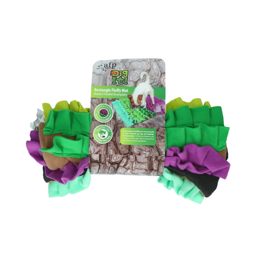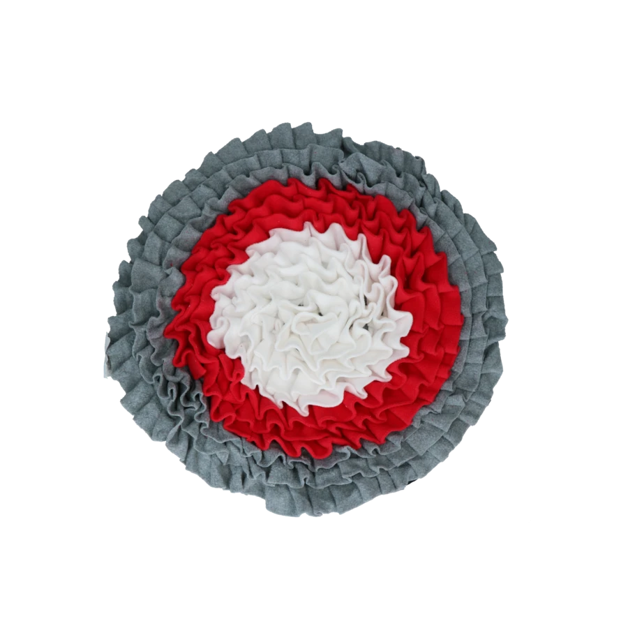 Deze leuke gekleurde mat is ontworpen om uw hond uit te dagen en veel speelplezier te brengen. Uw legt de mat op de grond en gooit er brokjes of andere traktaties op en laat uw hond ze opzoeken tussen de stukken stof. In 2 leuke kleuren
