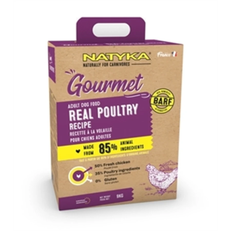 Natyka Gourmet Adult Poultry 9 kg is een semi-moist compleet hondenvoer met 85% dierlijke ingrediënten, met verse kip en vrij van gluten. Een heerlijke, voedzame maaltijd voor de hond die dicht bij de natuur blijft!