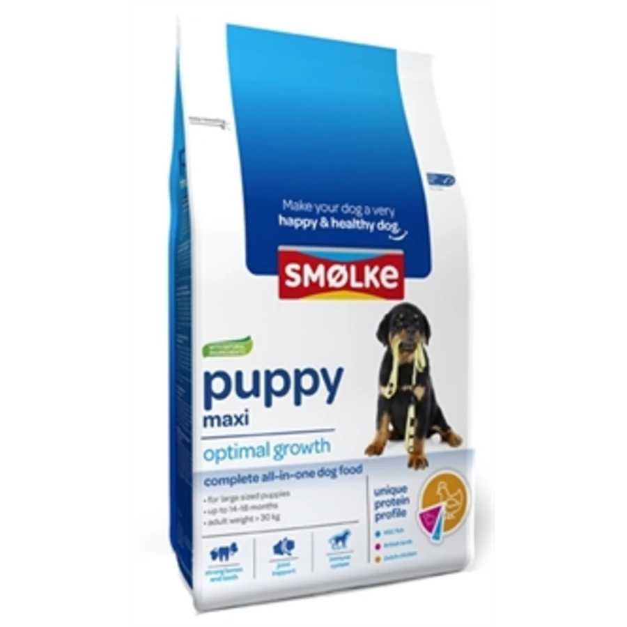 Smølke Puppy Maxi is een volledige en uitgebalanceerde voeding voor puppy’s van grote rassen tot de leeftijd van 18 maanden. Voor puppy’s van grote hondenrassen is het belangrijk dat ze niet te snel groeien. Daarom bevat de Smølke Puppy Maxi een aangepast energieniveau wat ervoor zorgt dat u hond de energie krijgt die hij nodig heeft voor een gelijkmatige groei. Daarnaast bevat deze voeding extra beta-glucanen om het kwetsbare immuun systeem optimaal te ondersteunen. Een ideale fosfor/calcium verhouding helpen uw pup de ontwikkeling van een sterk en gezond skelet en gebit. Daarnaast wordt de grote groei van het skelet ondersteund door de toevoeging van Glucosamine en Chondroïtine.